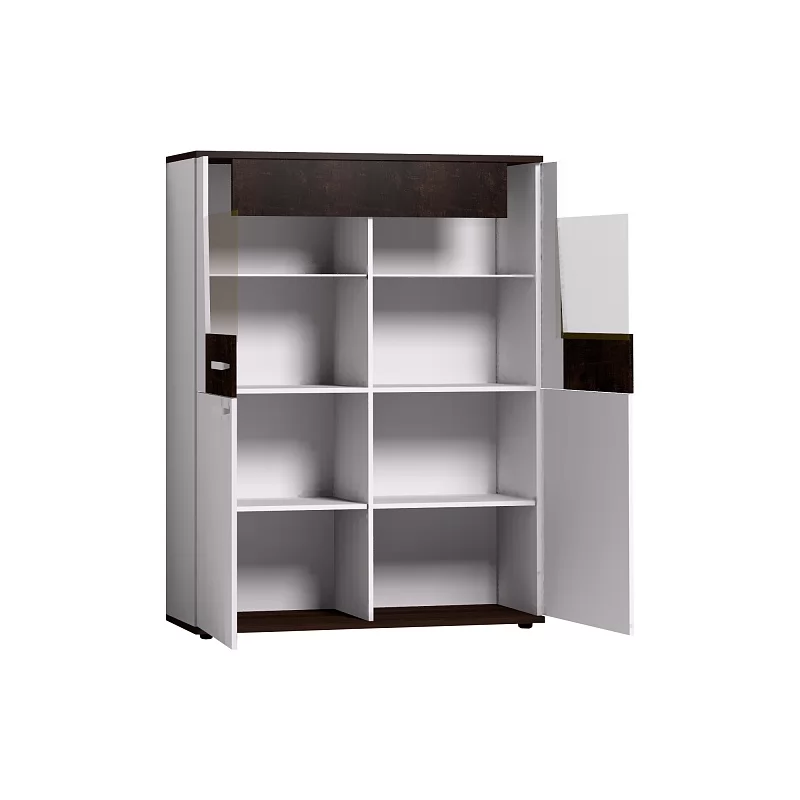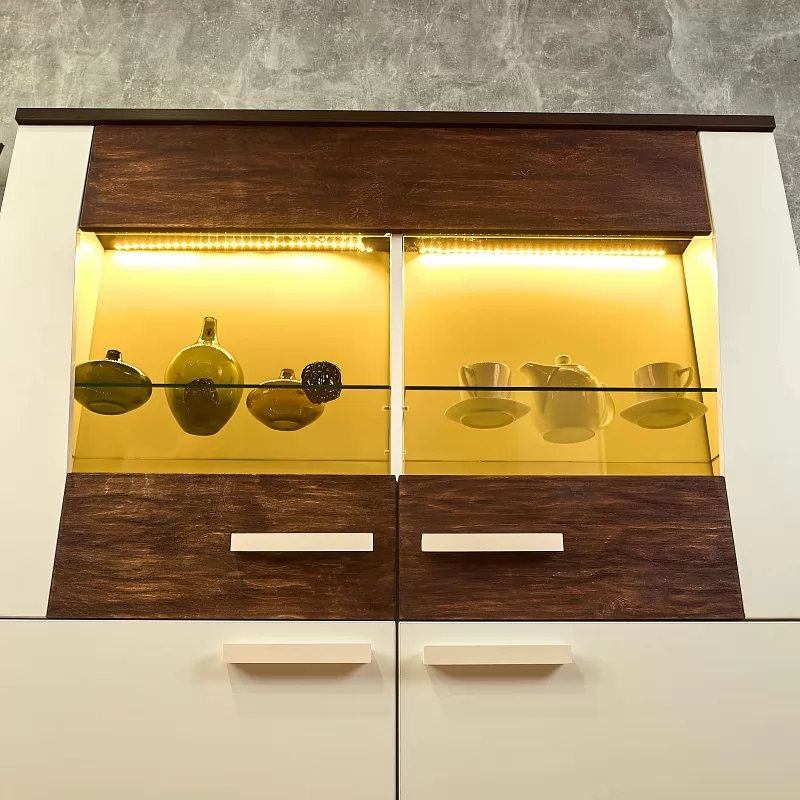 Невысокий Норвуд 22 Шкаф-сервант состоит из двух частей: верхняя - витрина и нижняя- тумба за глухими фасадами. Фигурный фасад верхней витрины эффектно совмещает в себе тонированное стекло, ЛДСП и брашированную деревянную вставку. Верхняя брашированная планка закреплена и не открывается вместе с фасадами. На стеклянных полках толщиной 6 мм можно разместить чайные сервизы.