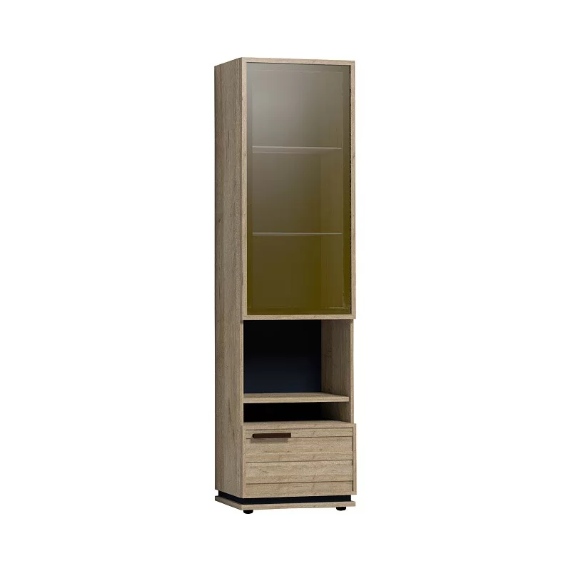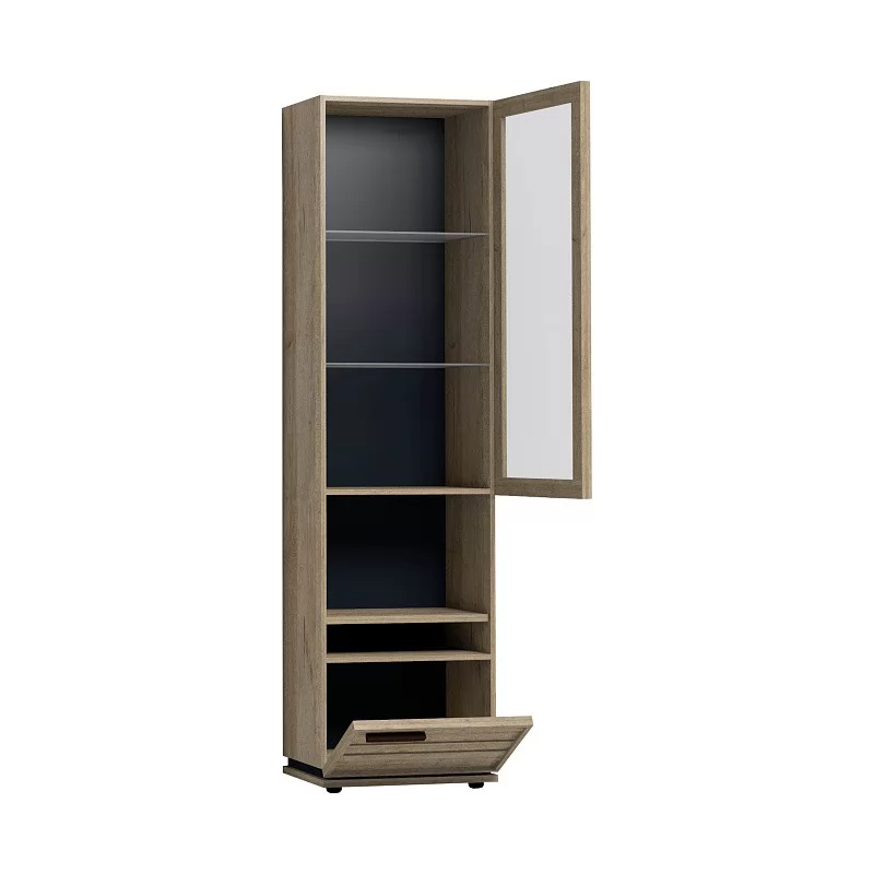 Высокий шкаф для посуды удобен своей функциональностью и эргономичностью конструкции. За тонированным стеклянным фасадом - 2 регулируемые по высоте бесцветные стеклянные полки. Витрина открывается за боковой свес. На открытой полке разместите фотографии или элементы декора, а за глухим откидным фасадом спрячьте документы и ценные вещи от посторонних глаз. Регулируемые опоры шкафа позволят компенсировать незначительные неровности пола.