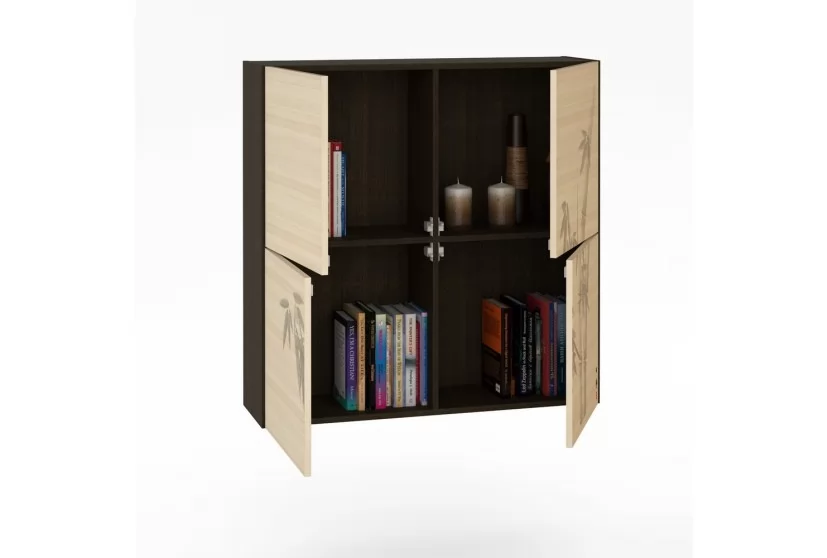 Шкаф навесной 904 "Киото"имеет 4 симметричные ниши с распашными дверками, открывающимися нажатием. Изюминка данной серии мебели - это монохромная или цветная печать рисунков в японском стиле на фасадах.