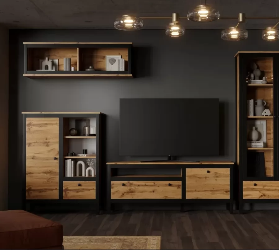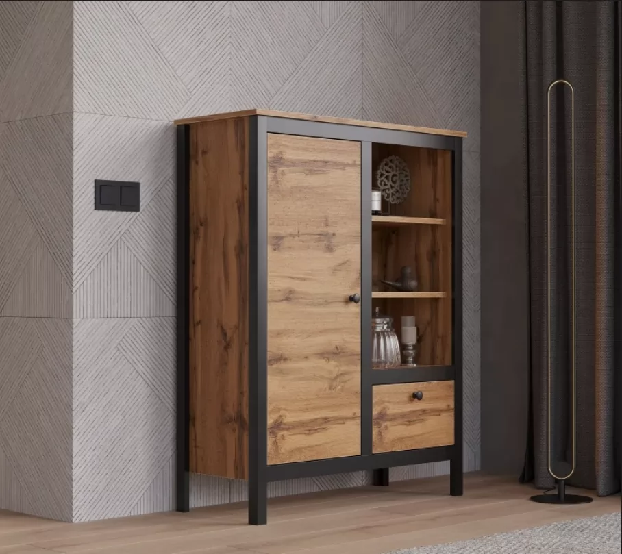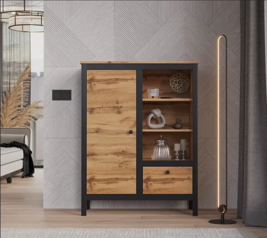 Ассиметричный дизайн придает модели индивидуальности. Открытые полки справа послужат удобным местом для размещения элементов декора и коллекций. В закрытых полках, скрывающихся за распашной дверкой расположены две вместительные полки. Выдвижной ящик оснащен шариковыми направляющими, что гарантирует плавность закрытия.