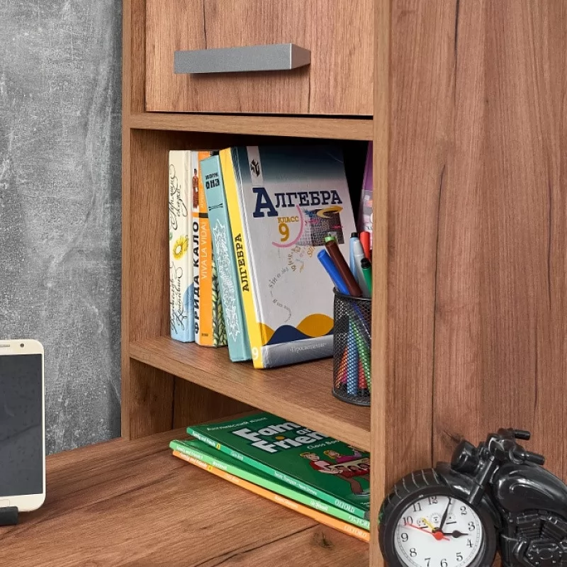 Шкаф с глухим фасадом и открытыми нишами станет еще одним помощником ребенку для размещения его книг, рабочих тетрадей и письменных принадлежностей. Глухой фасад шкафа перенавешивается как на правую, так и левую сторону.