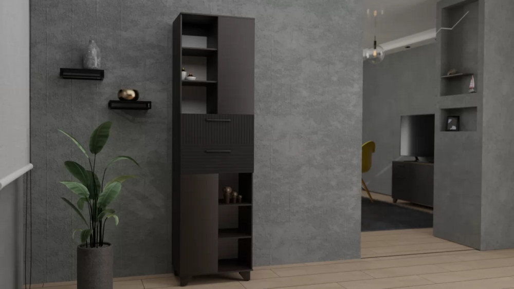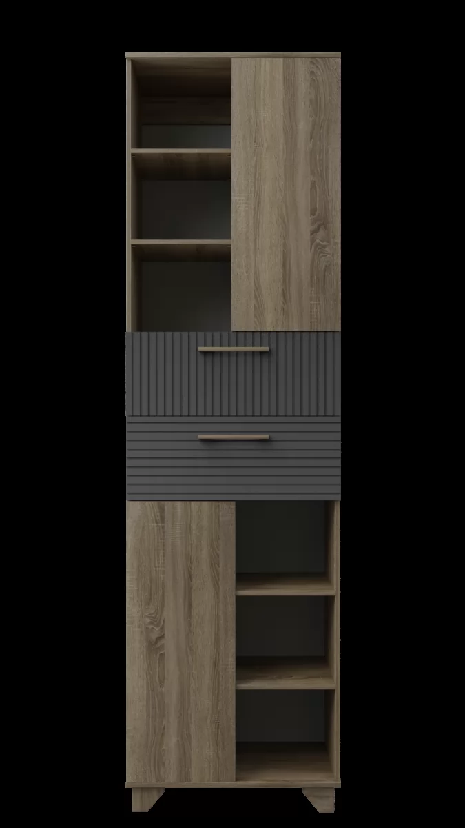 Шкаф-пенал — это отличный функциональный элемент для гостиной. Пенал оснащен открытыми полками и полками со створками, что позволяет хранить и предметы декора, и личные вещи, документы. Для плавности хода створок петли оснащены доводчиками. В конструкции пенала имеются ящики, оснащенные шариковыми направляющими полного выдвижения. Современная система «push-to-open» позволяет открывать створки нажатием руки. Ящики оснащены ручками из натурального массива дуба. Ножки, выполненные из массива дерева, имеют регулировку по высоте. Выбор цветов корпуса и фасада позволит найти удачный вариант для интерьера.