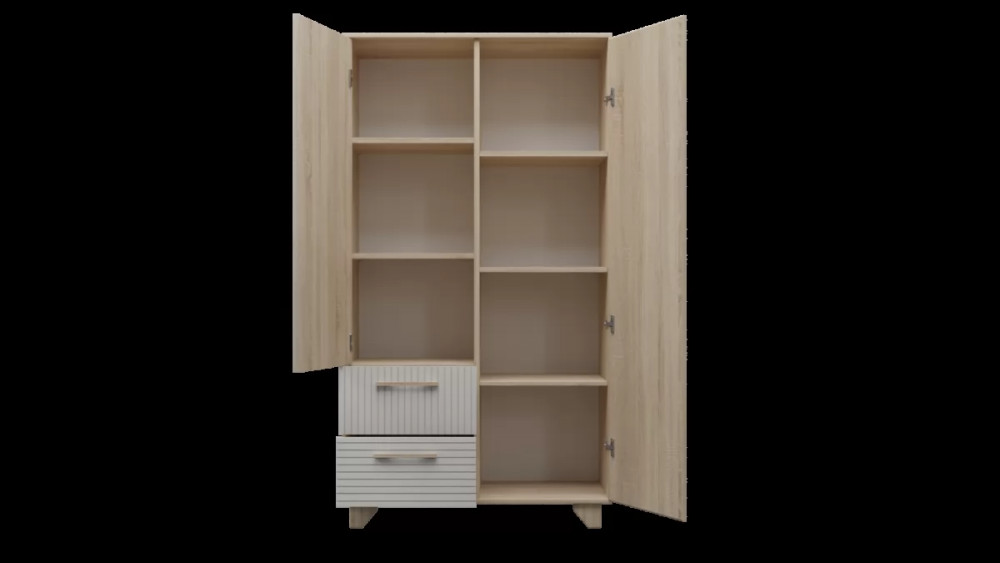 Стеллаж Копенгаген без стекла станет для гостиной практичным функциональным дополнением. Стеллаж имеет семь полок и два выдвижных ящика. Створки оснащены петлями с доводчиками, ящики — шариковыми направляющими полного выдвижения. В конструкции стеллажа предусмотрен механизм открывания нажатием «push-to-open». Ручки ящиков выполнены из натурального массива дуба. Ножки изготовлены из массива дерева и регулируются по высоте.