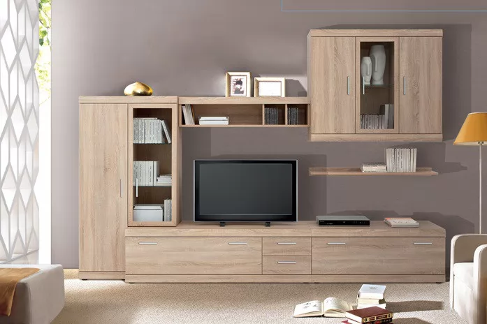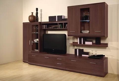 Основными отличиями комплекта являются простые геометрические формы, вместительные элементы и плоские продолговатые ручки. Два варианта цвета набора - нежный и теплый оттенок дуба и насыщенный цвет венге - великолепно впишутся в любой интерьер гостиной комнаты.