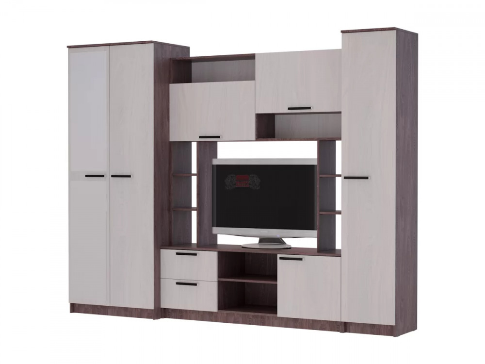 Современная и модная конструкция совмещает в себе множество секторов: открытые и закрытые полки с дверцами, выдвижные ящики, большой и просторный отдел со штангой для вешалок с вещами. Эта часть шкафа закрыта дверцей с двумя зеркалами.