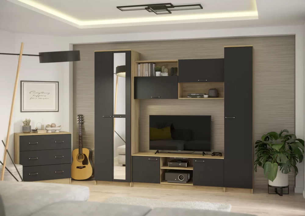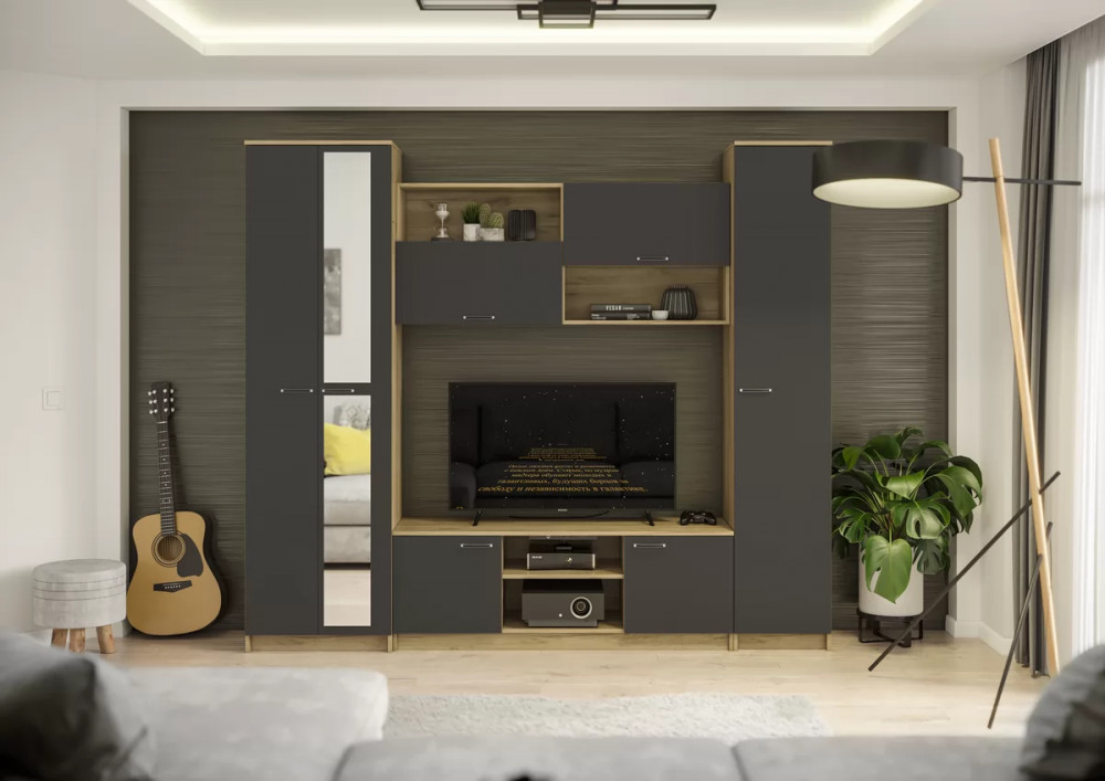- Гостиная состоит из бельевого шкафа, средней секции и платяного шкафа