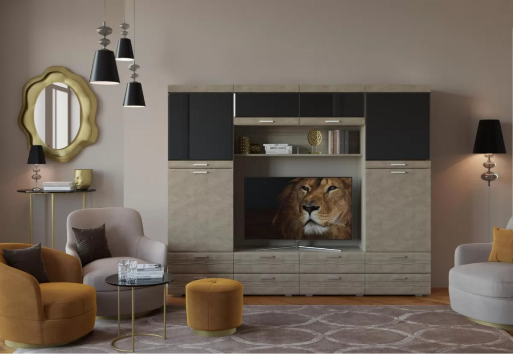 Фасадная часть гостиной - фрезерованная плита МДФ в пленке ПВХ в комбинации с черным или белым стеклом лакобель (Польша). В серии используется ручка-скоба 96 мм (сатин светлый). Корпус - ЛДСП 16 мм. Задняя стенка гостиной выполняется из ЛДВП в цвет корпуса. Тумбы и шкафы комплектуются регулируемыми опорами L-20. Выдвижные ящики снабжены шариковыми направляющими полного выдвижения.