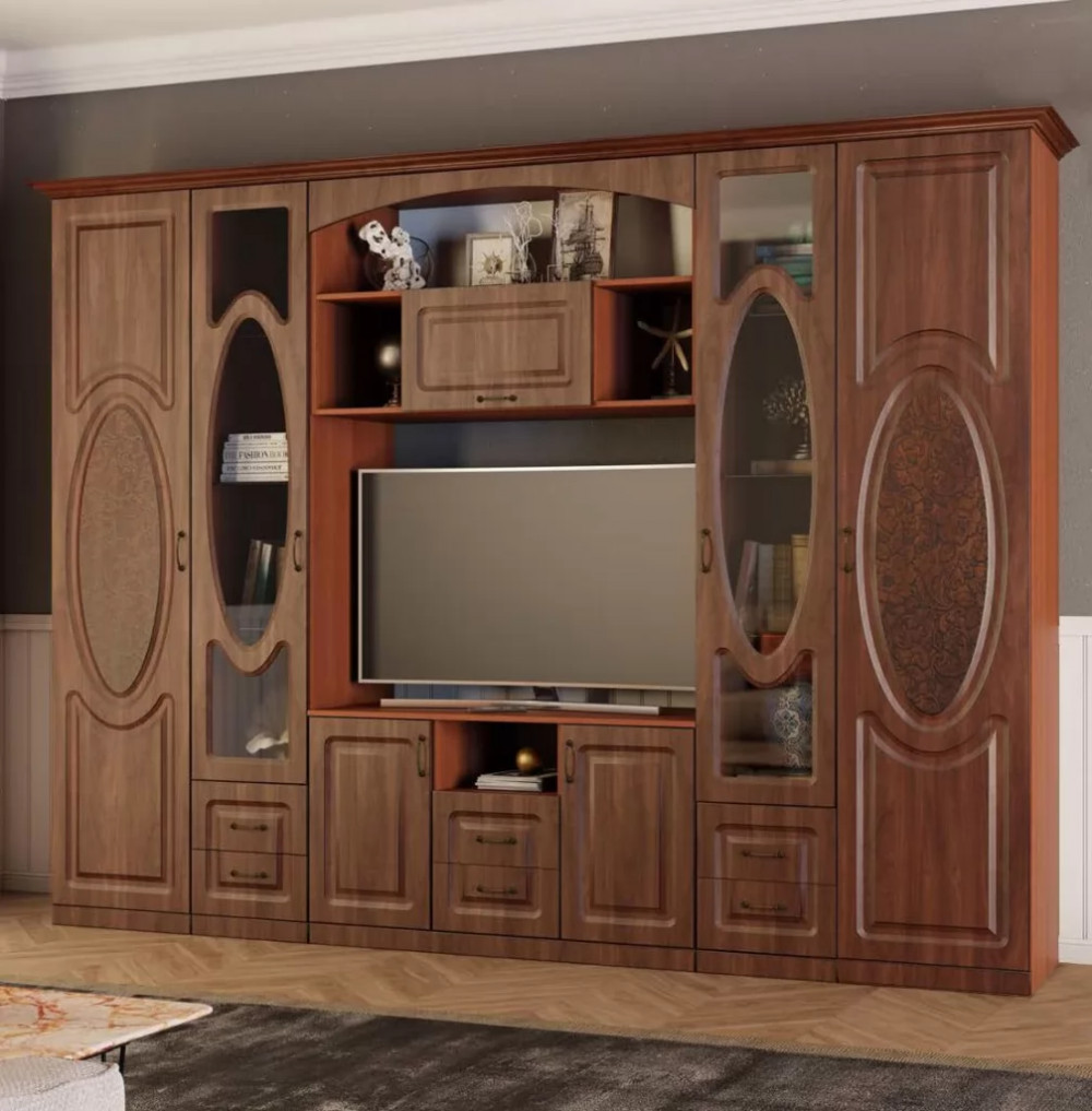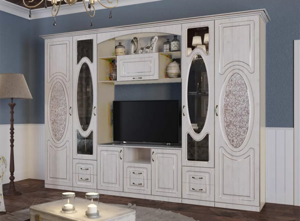 Гостиная «Прованс-2» вызовет интерес у поклонников эпохи ренессанса. Эта мебель достойна украсить будуар знатной дамы или даже самой королевы. Светлая отделка, плавные линии зеркал, овальные декоративные вставки на дверцах, закругленная в верхней части ниша придают модели изящество и аристократизм. Несмотря на свои крупные габариты, гарнитур не кажется громоздким.