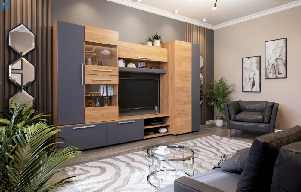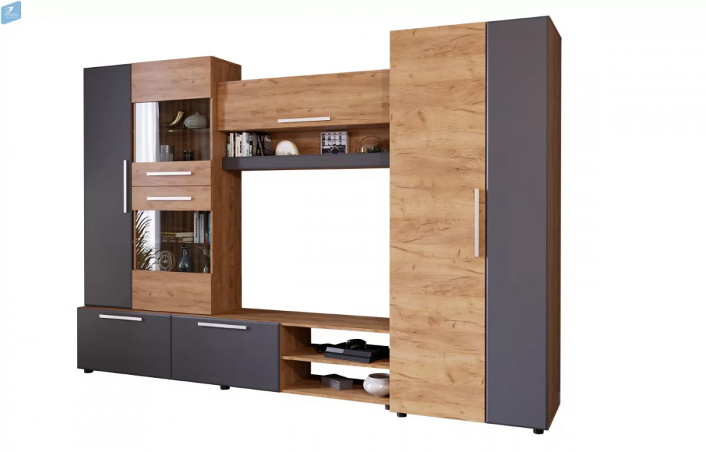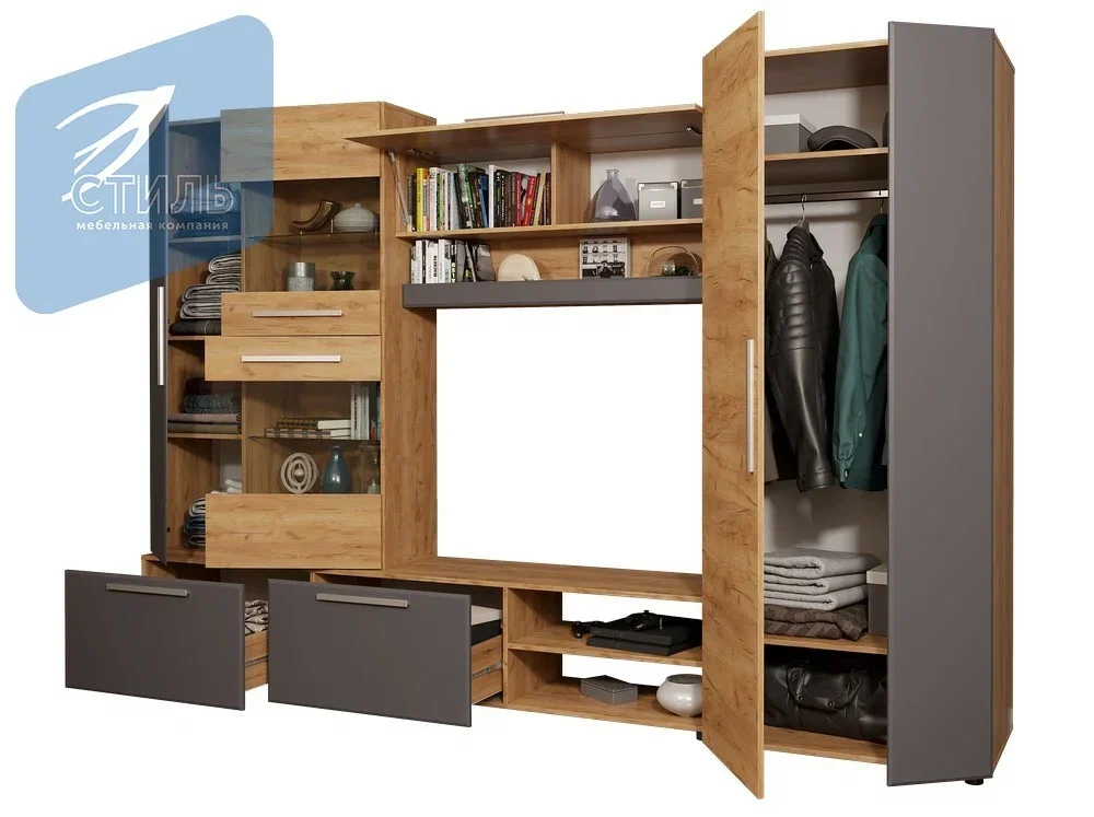 Отличительными особенностями модели являются наличие вместительных модулей (шкафа, надстройки, антресоли, тумбы под ТV) и элегантный дизайн, сочетающий изысканность цвета и фактур корпуса и фасадов яркого «Дуб Крафт золотой» и мягкого «Графит СОФТ».