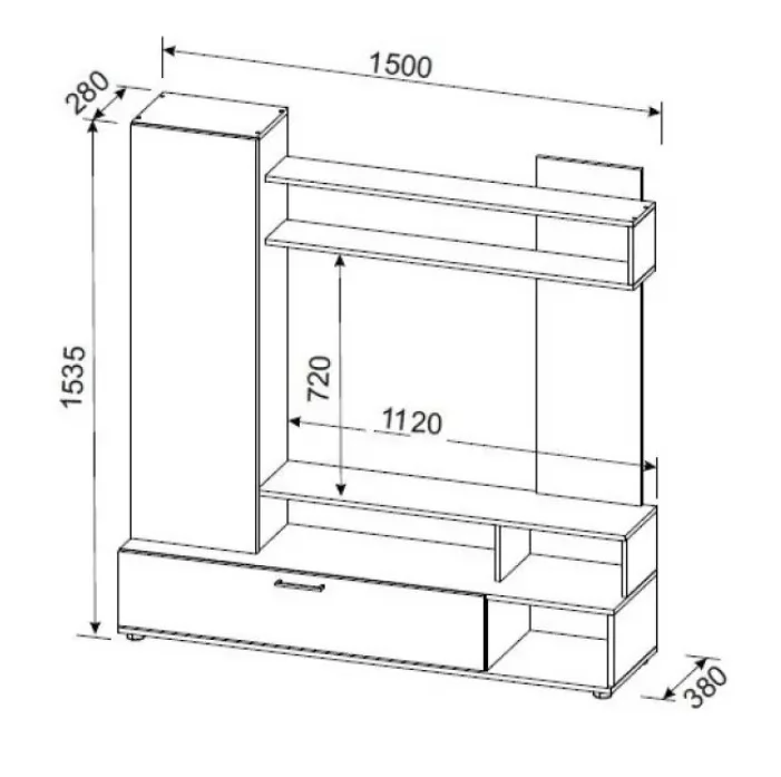 Размеры ниши под ТВ (ШхВхГ) 1120х720х380 мм.