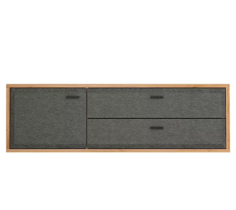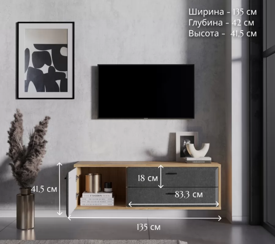 Тумбочка имеет выдвижные ящики и секцию за распашной дверцей. Такая комбинация ниш идеально подходит для размещения мультимедийных устройств, DVD-плееров, игровых консолей или аудиотехники. Ящики предоставляют скрытое пространство для хранения пультов, кабелей, инструкций и других аксессуаров.
