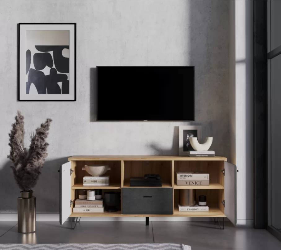 Верхняя крышка тумбы надежно разместит на себе телевизор и другие мониторы. Удобная комбинация ящиков и полок гарантирует достаточно место для размещения аудио и видео аппаратуры, игровых консолей, приставок, пультов и книг. Отверстия на задней стенке гарантируют спутывание проводов и кабелей.