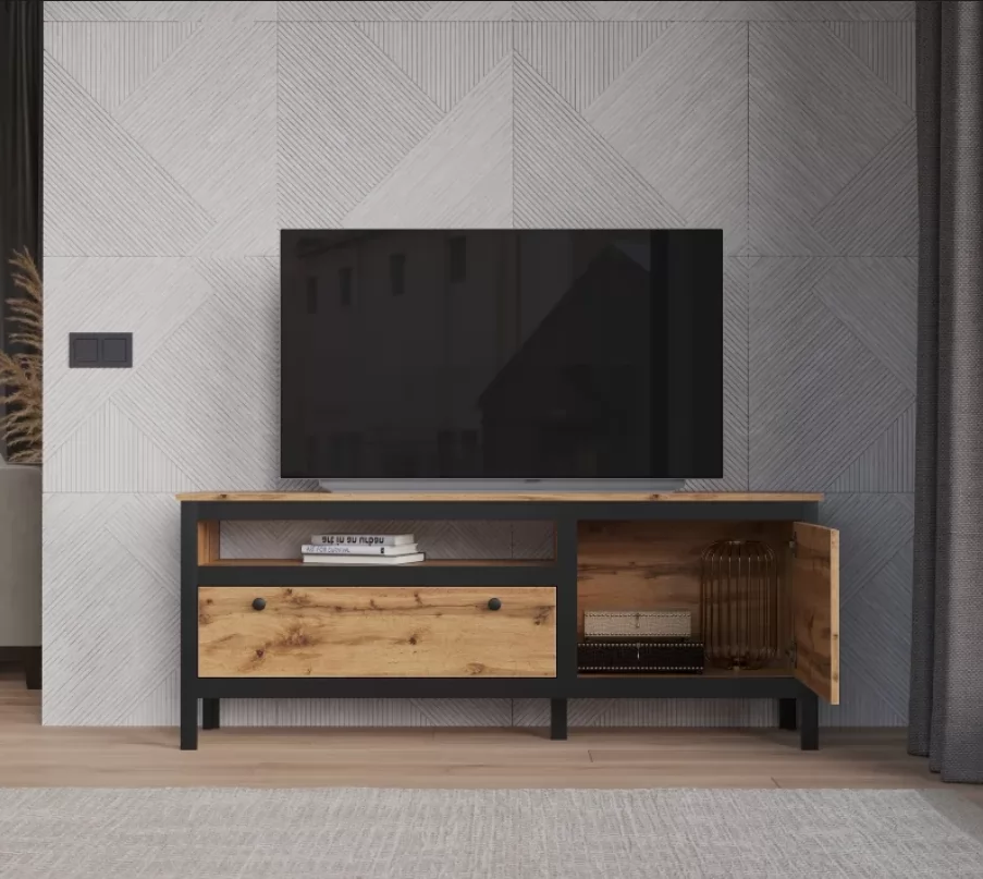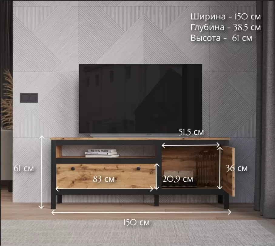 Благодаря сочетанию открытых и закрытых ниш для хранения вы сможете организовать хранение с максимальным комфортом. Просторная столешница разместит на себе телевизор, приставки, колонку и другую видеотехнику. Для максимальной устойчивости вы можете прикрепить тумбочку к стене, все необходимые элементы идут в комплекте.