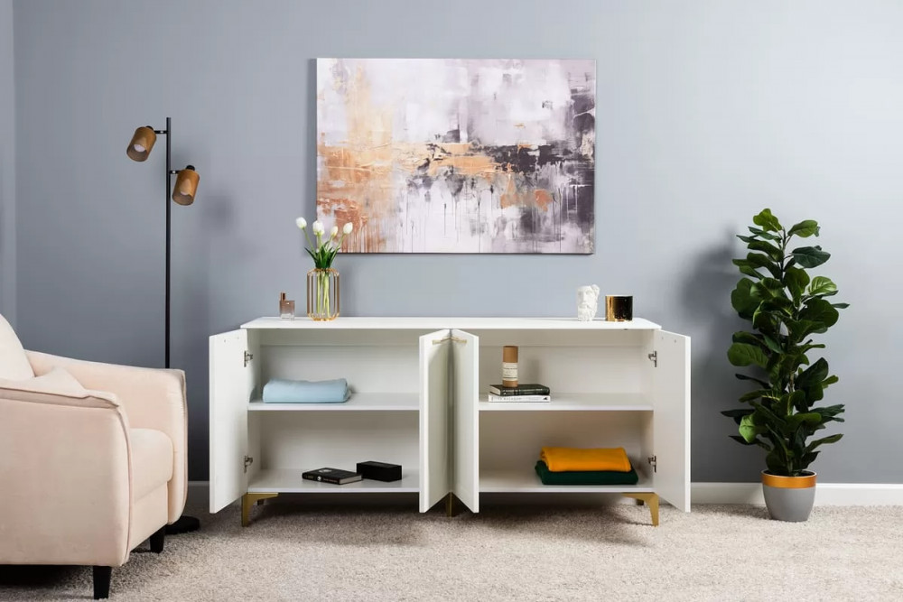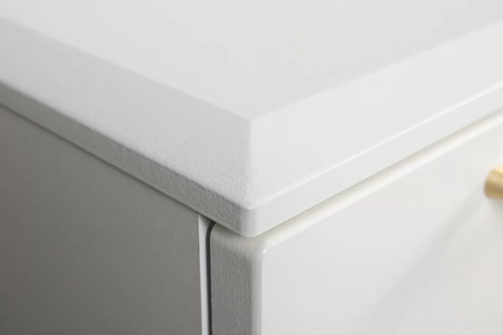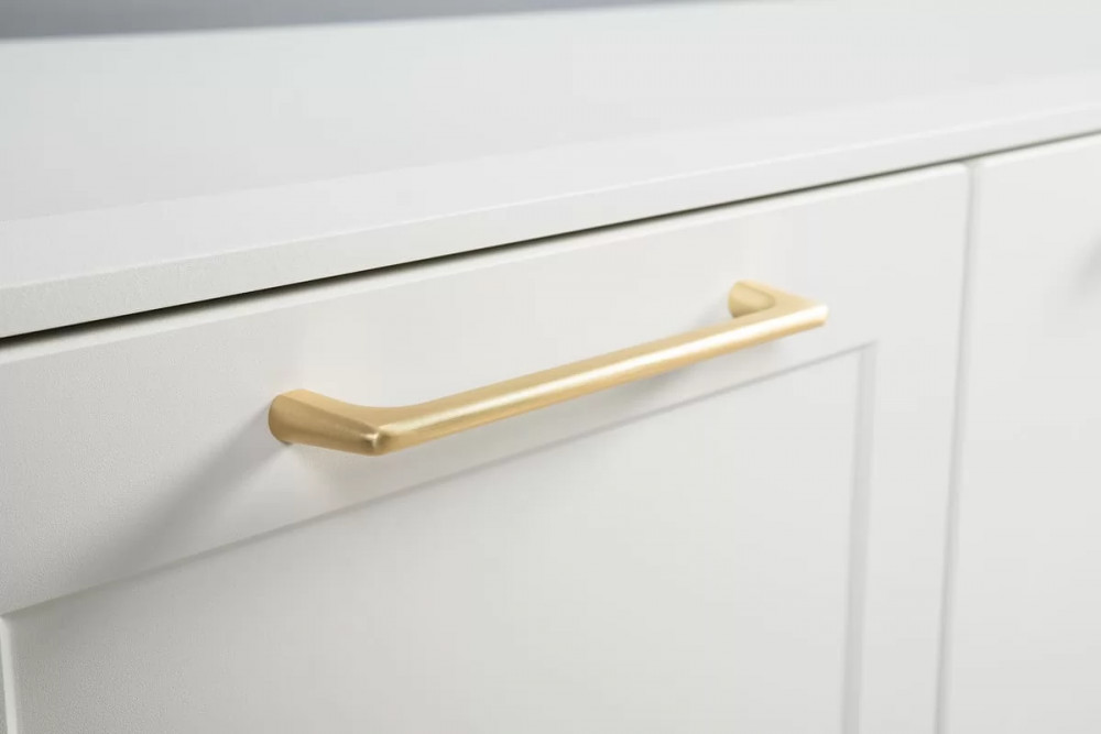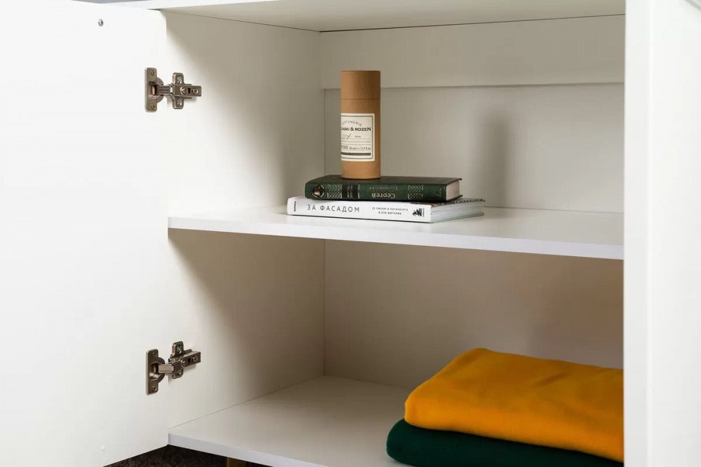 Фасады с фрезеровкой и верхняя крышка из МДФ сочетаются с металлическими ручками и опорами, создавая притягательный акцент в интерьере.