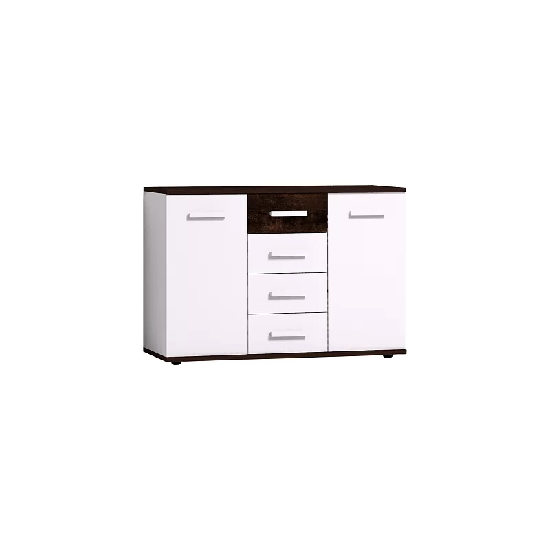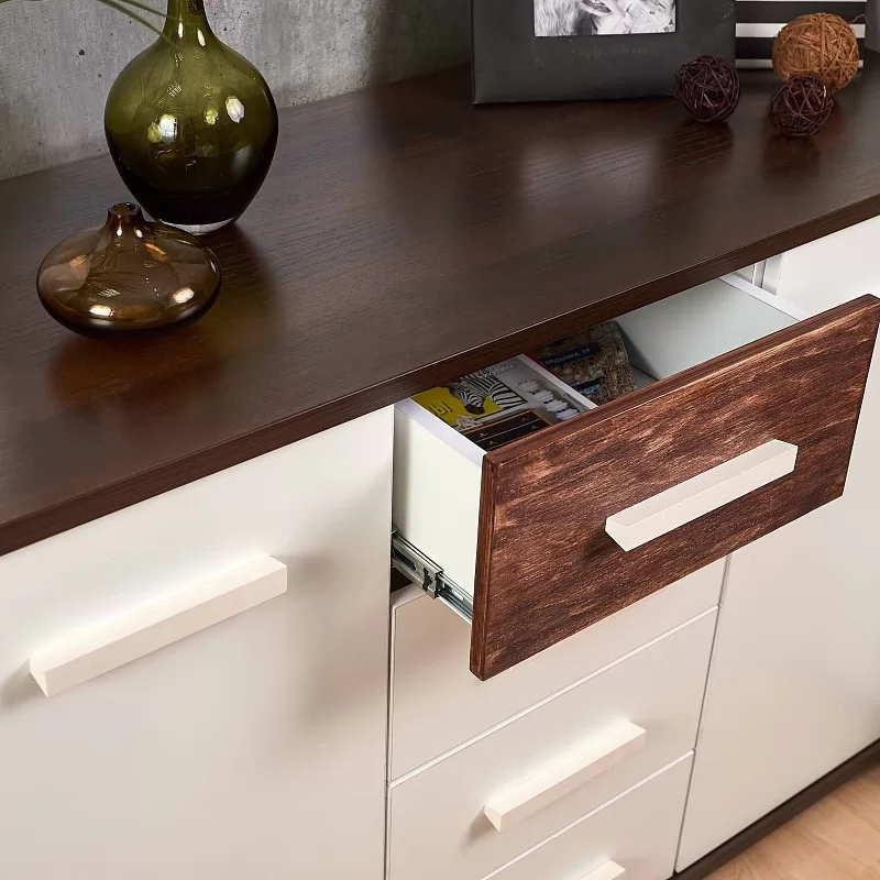 Стильная Норвуд 5 Тумба МЦН отвечает требованиям скандинавского стиля. Яркие акценты тумбы - контрастные горизонтальные детали толщиной 22 мм в декоре Орех Шоколадный и фасад верхнего ящика из дерева с брашировкой. Четыре выдвижных ящика на шариковых направляющих, две распашные дверцы по бокам легко и удобно открываются за светлые ручки из массива. Регулируемые опоры компенсируют неровности пола.