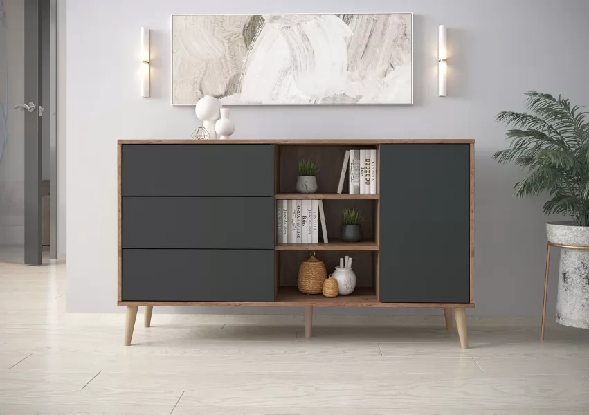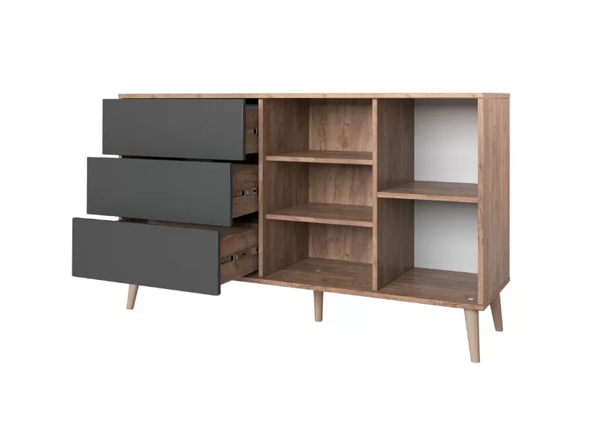 Тумба многофункциональная Арт. 6-56003 комплектуется 3 выдвижными ящиками, открытыми полками и полкой за глухой дверкой.