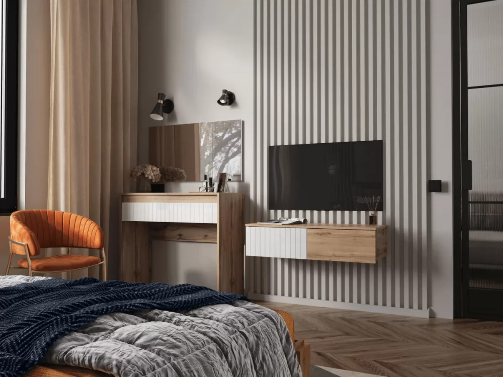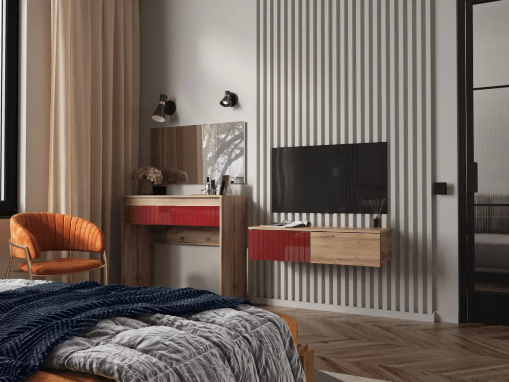 Модульная спальня «Ливерпуль» : спокойные цвета корпуса с ярким акцентом в виде фасада из МДФ. Опора в стиле «Лофт» притягивает взгляд. Благодаря системе открывания «push to open» изделия выполнено без ручек,