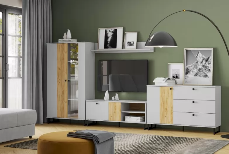 "БРУНО" - современный дизайн с характером. Цвет платиново-серого и золотого дуба подчеркнут контрастными элементами - стеклом в витринах и черными ручками,металлическими черными опорами. Модульная колекция, состоящая из отдельных элементов, призвана максимально продуктивно использовать пространство и придать ему стильный и современный вид. Контрастные текстуры — эффектное сочетание двух абсолютно разных цветов, которые при этом гармонично смотрятся вместе.