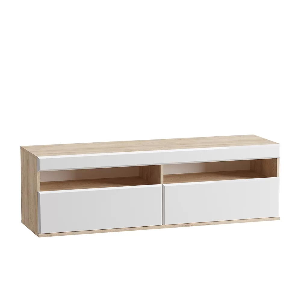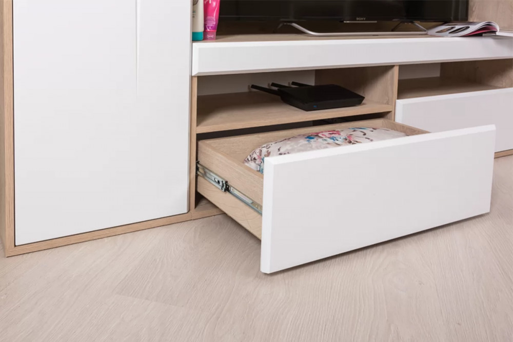 Тумба для бытовой аудио и видеотехники"Альба 3" имеет две две открытые ниши и два вместительных выдвижных ящика.