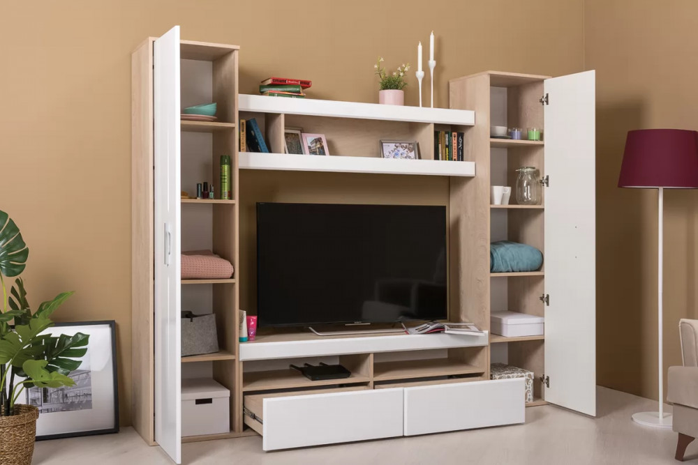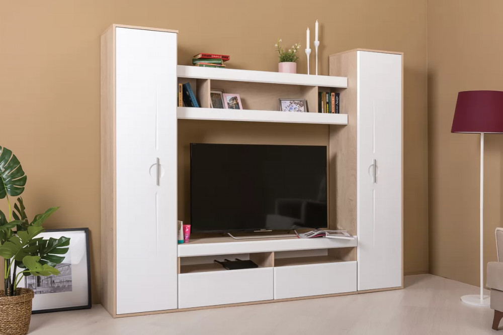 Белый цвет – основа большинства стилей. Это касается и классики, и современных ультрамодных трендов. Сложно найти что-то более универсальное и практичное для оформления современных гостиных. Гостиная "Альба 3" с белыми глянцевыми фасадами наполняет комнату светом, визуально расширяет пространство. Корпус модулей в текстуре светлого дерева будет уместен в интерьере в скандинавском или эко стиле.