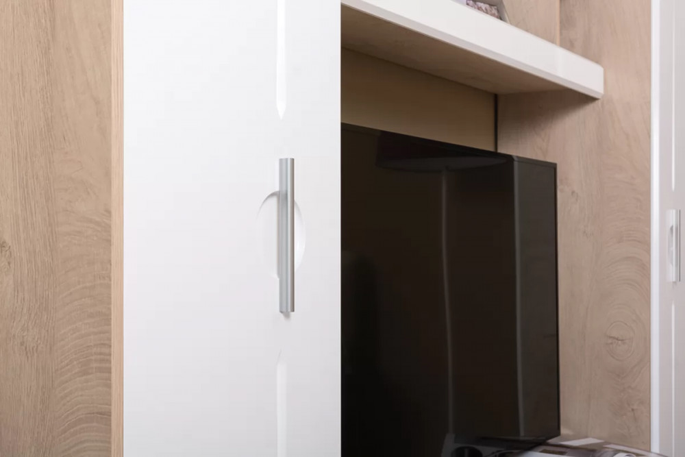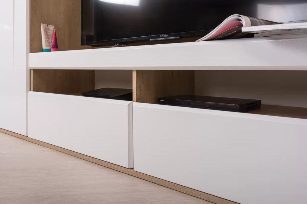 Глянцевые фасады модулей из МДФ с уникальной фрезеровкой и фасками. Фасады ТВ тумбы открываются за край, а фасады пеналов - за металлическую ручку. Металлические ручки цвета "Никель жемчужный". Глубина пеналов и тумбы увеличена для удобства хранения.