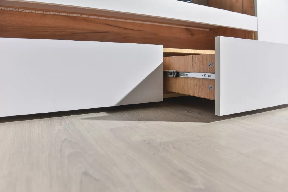 Глянцевые фасады модулей из МДФ с уникальной фрезеровкой и фасками. Фасады ТВ тумбы открываются за край, а фасады пеналов - за металлическую ручку. Металлические ручки цвета "Никель жемчужный". Глубина пеналов и тумбы увеличена для удобства хранения.
