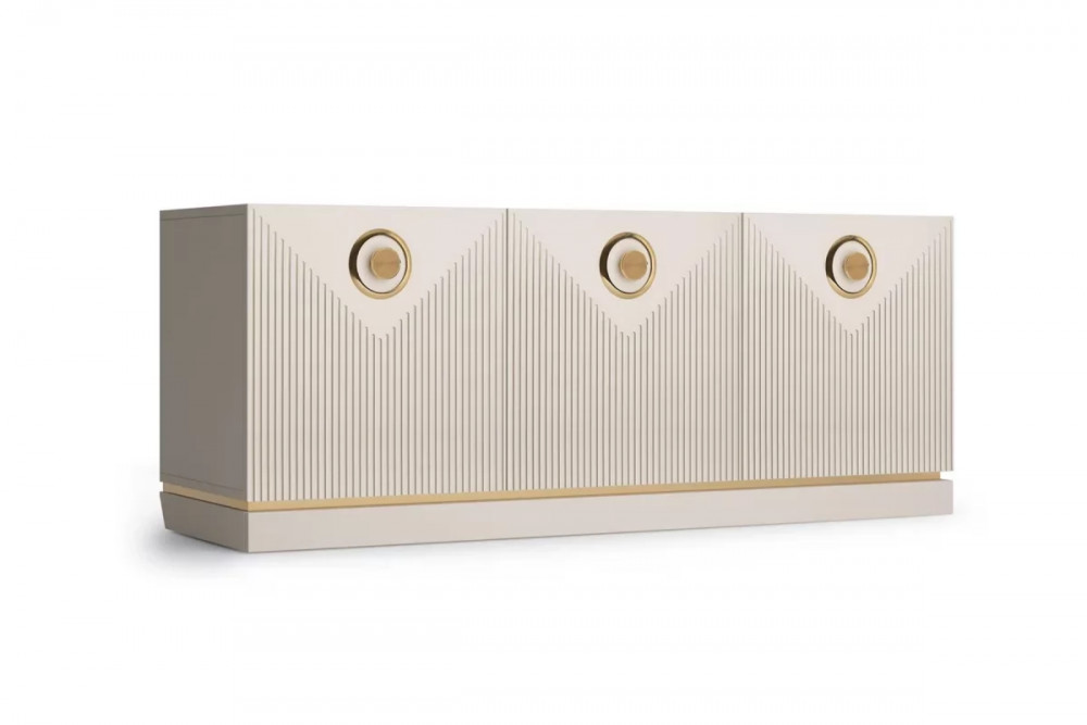 Мебель выполнена в теплом, приятном для глаз оттенке «сатин». Корпус из ЛДСП дополняют фасады из высококачественного МДФ в плёнке ПВХ с эффектом soft touch. Оригинальный дизайн мебели подчеркивают эффектные металлические ручки в цвете глянцевое золото, золотая кромка, разделяющая корпус и цоколь, а также фрезеровка фасадов в виде параллельных тонких полос.
