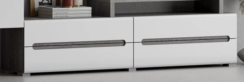 Фасады МДФ под пленкой ПВХ, ящики укомплектованы направляющими полного выдвижения.. Особенностью серии является интегрированная ручка, которая придает гостиной индивидуальность и практичность.