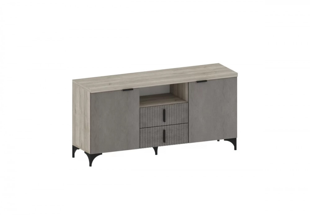 Мебель изготовлена из высококачественного материала ЛДСП — 16 мм, класса эмиссии Е1. Фасады с оригинальной фрезеровкой изготовлены из МДФ 16 мм под пленкой ПВХ в цвете Айронвуд серебро и Лофт голдэн пэлас. Тумбы декорированы крышкой толщиной 32 мм и облицованы кромкой 2 мм.
