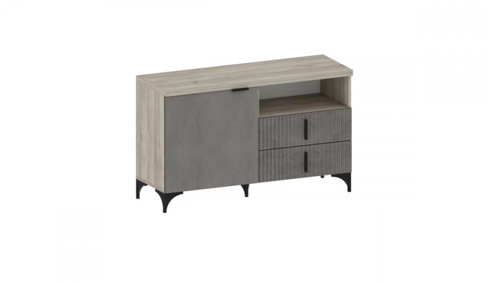 Мебель изготовлена из высококачественного материала ЛДСП — 16 мм, класса эмиссии Е1. Фасады с оригинальной фрезеровкой изготовлены из МДФ 16 мм под пленкой ПВХ в цвете Айронвуд серебро и Лофт голдэн пэлас. Тумбы декорированы крышкой толщиной 32 мм и облицованы кромкой 2 мм.