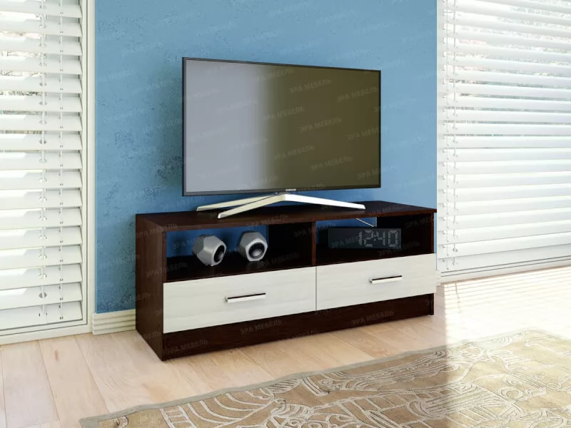Тумба TV 1 – это элегантная конструкция для телевизора. Полка изготовлена из ЛДСП и имеет следующие параметры: высота – 465 мм, глубина – 362 мм, ширина – 1200 мм. Тумба разделена на 4 части. Верхние представляют собой открытые полки для декора. Нижние отделы – это выдвижные ящики, в них вы можете хранить любые принадлежности для TV, документы, фотографии и т.д.