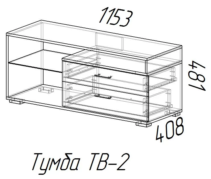 Тумба TV 2 – это простая и стильная конструкция для телевизора, изготовленная из ЛДСП. Высота полки – 481 мм, глубина – 408 мм, ширина – 1153 мм. Конструкция имеет открытые полки без дверец, а также выдвижные ящики для хранения некрупных аксессуаров, игровой приставки, пультов дистанционного управления и т.д.