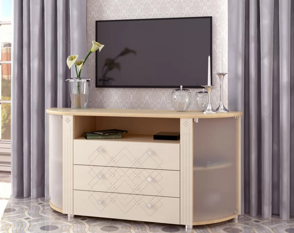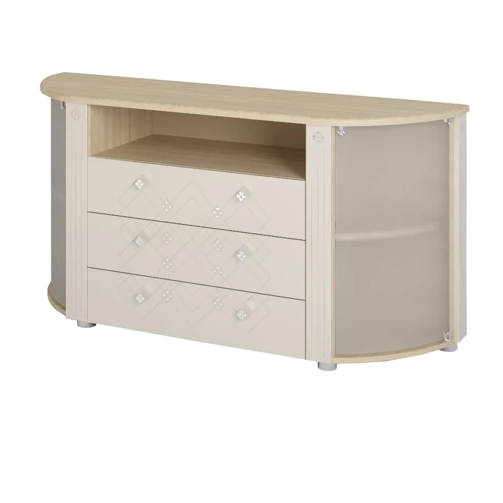 Тумба ТВ из серии "Капелла" с тремя выдвижными ящиками и двумя боковыми отделениями с полками.