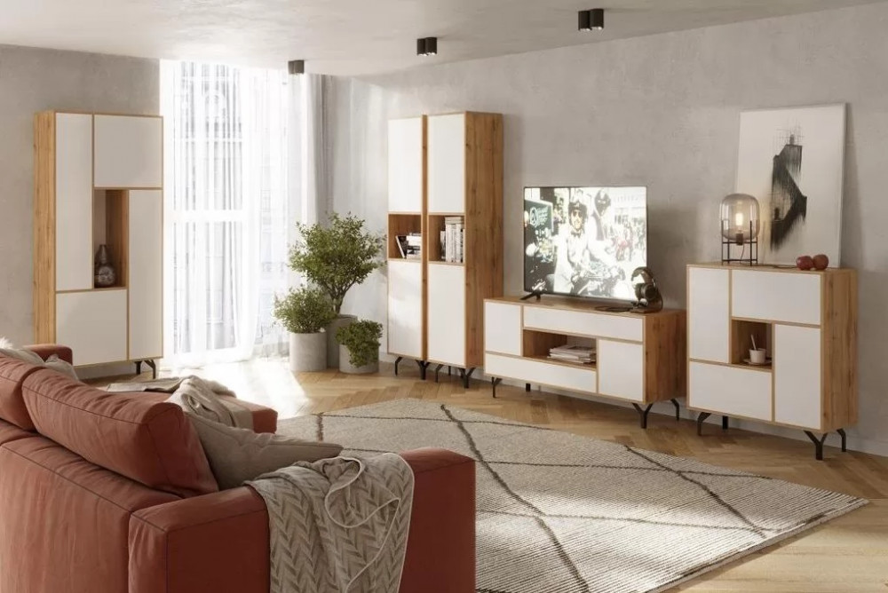 Гостиная «Лабиринт» украсит интерьер и станет гармоничным дополнением Вашей комнаты. Гостиная выполнена в современном стиле ЛОФТ. Каждый элемент гостиной является отдельным полноценным предметом интерьера. В состав гостиной входит комод, тв тумба, узкий и широкий шкафы. Все они изготовлены из современных экологических материалов и имеют ножки из черного металла.