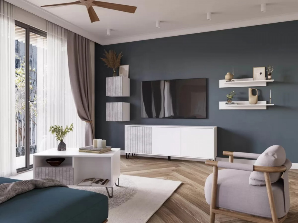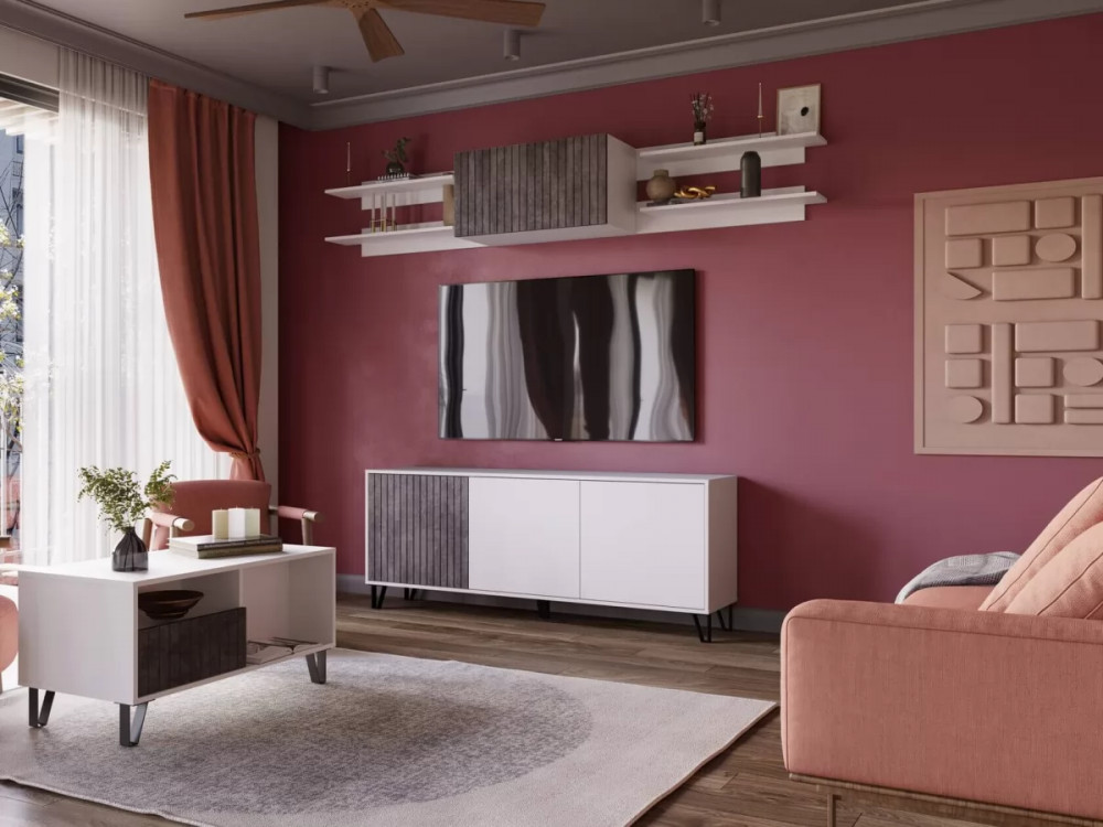 Модульная система «Ливерпуль» выполнена в самых актуальных сочетаниях: спокойные цвета корпуса с ярким акцентом в виде фасада из МДФ. Опора в стиле «Лофт» притягивает взгляд. Стильная и вместительная ТВ-тумба «Ливерпуль» отлично подойдет под размер любого TV. Журнальный стол, полка и шкаф навесной прекрасно помогут завершить Ваш образ интерьера. Благодаря системе открывания «push to open» изделия выполнены без ручек.