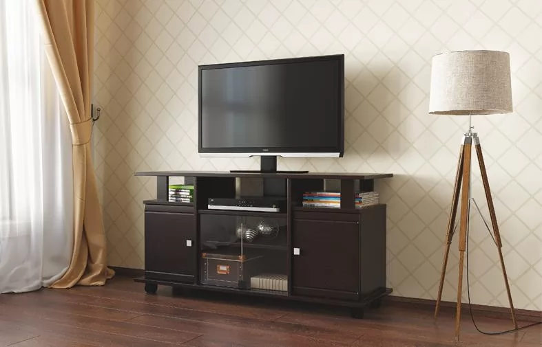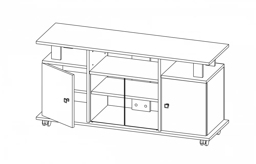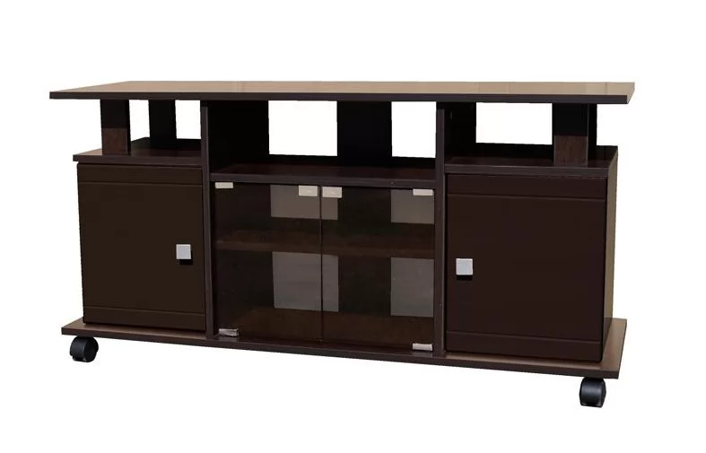 Удобная ТВ-тумба, имеющая несколько отделов для размещения аппаратуры, дисков и других предметов. Нижний большой отдел модели разбит на три секции: центральная имеет полку внутри и закрывается стеклянными дверцами, а боковые закрываются глухими дверцами, оснащёнными металлической фурнитурой. Вся конструкция держится на единой платформе с колёсиками, что обеспечивает тумбе высокий уровень мобильности.