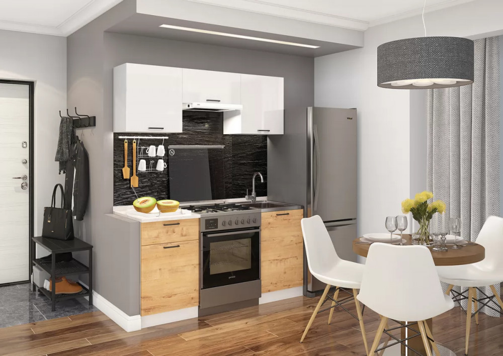 Стильная и привлекательная кухня «Дуся» станет отличным решением для маленького помещения и малогабаритных квартир, позволит сэкономить полезное пространство и убрать все кухонные принадлежности от посторонних глаз.