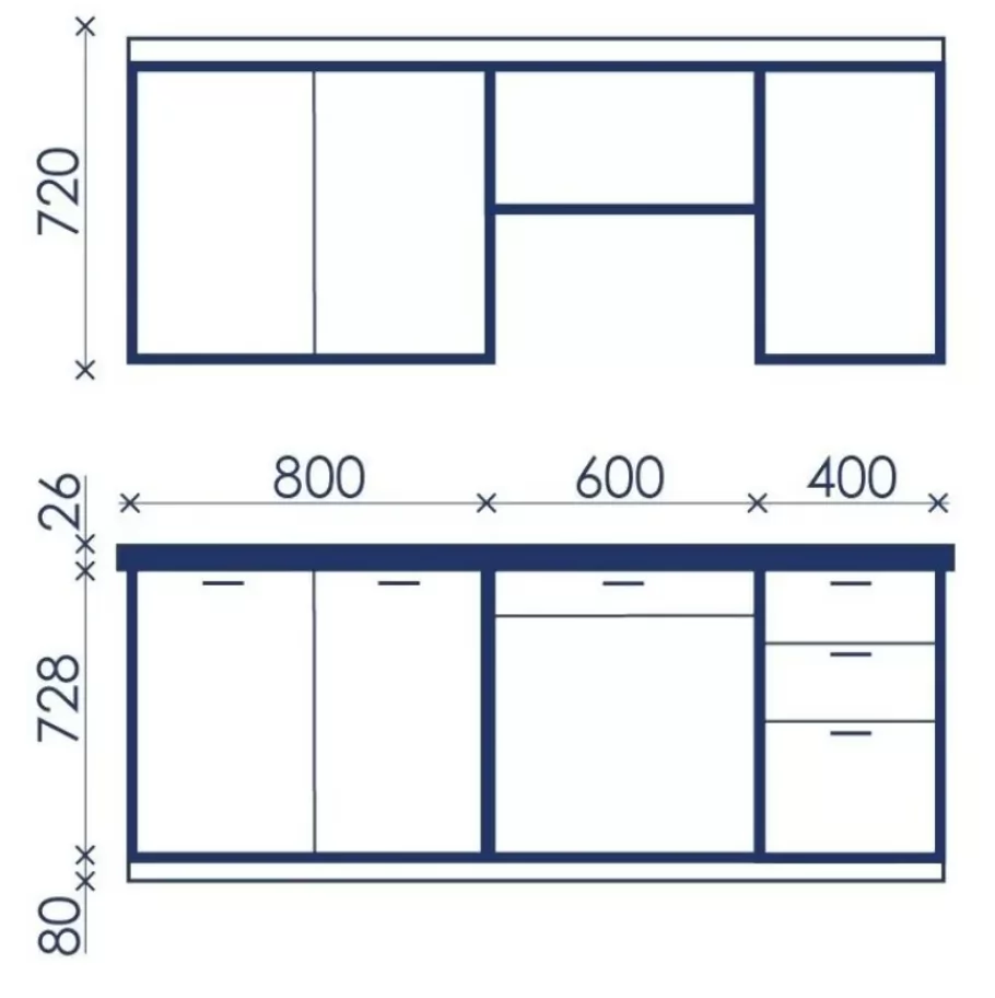 Низ: 1800х846х600 (по столешнице) мм