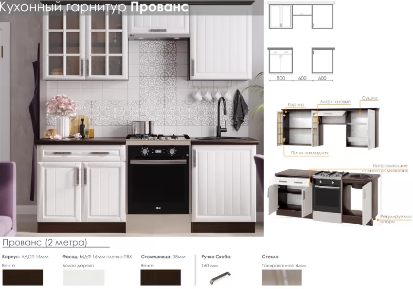 Кухня Прованс 2м столешница 38 мм Белое дерево/Венге