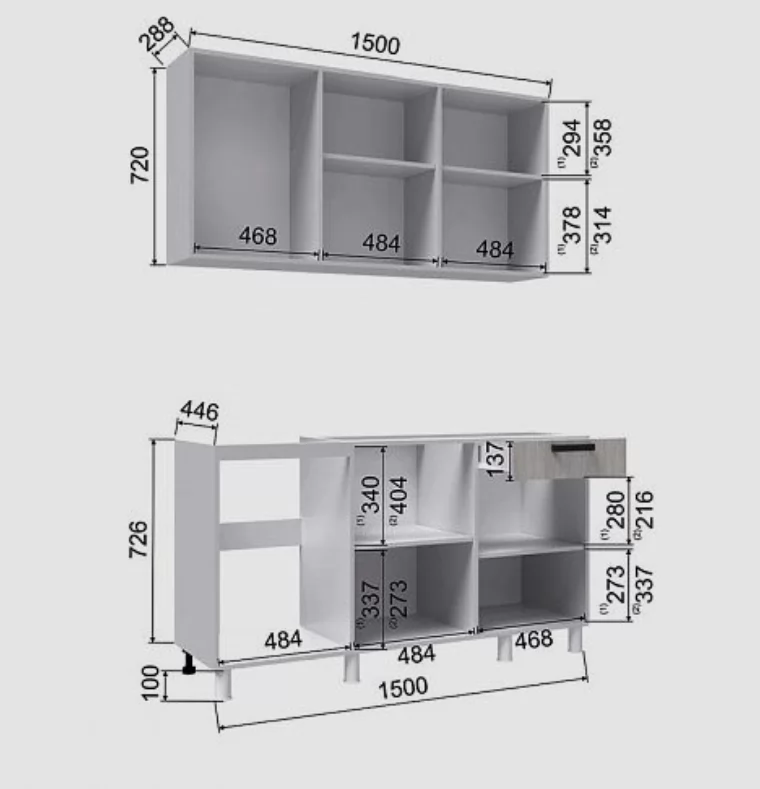 Высота верхних шкафов, мм: 720