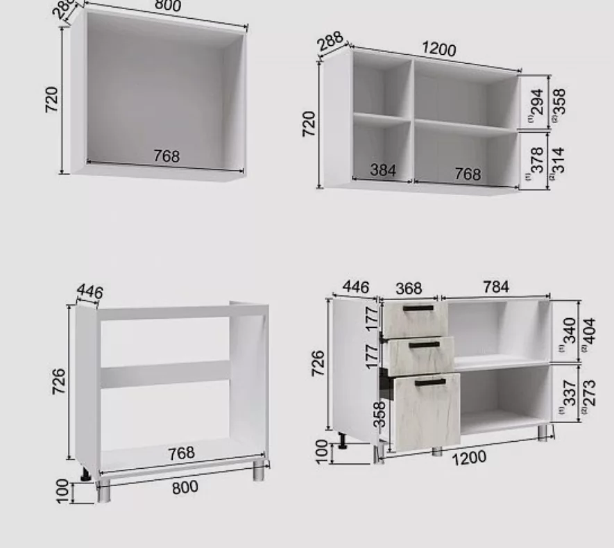 Цоколь, столешница, стеновая панель, посудосушитель в комплект не входят.