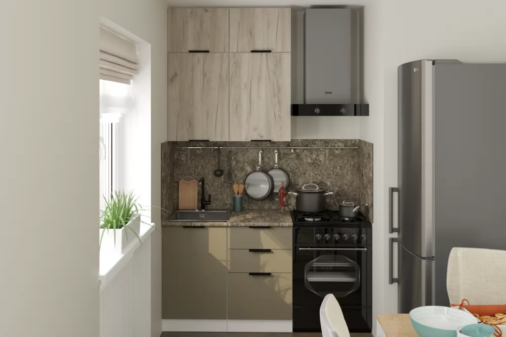 Кухонный гарнитур Альба мини из ЛДСП в модных цветах “Дуб браун” и "Мокко" впишется в современный дизайн интерьера. Подойдет как для частного дома, так и для небольшой квартиры. Напольные и подвесные шкафы позволят разместить всю кухонную утварь. Гарнитур состоит из набора шкафов, которые органично комбинируются между собой. Ящики, полки, навесные шкафы, тумбы и пеналы можно менять местами, создавая практичное рабочее пространство.