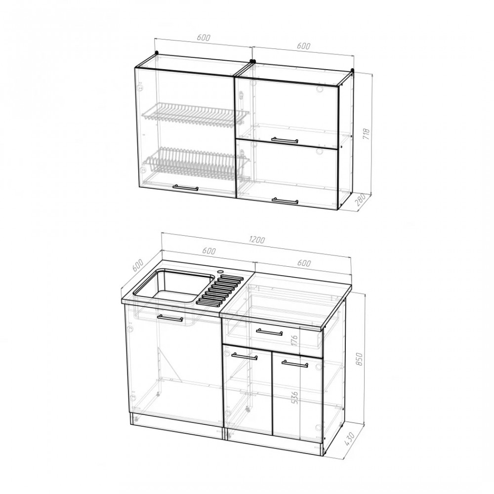 Мойки, смесители и посудосушители в комплекты гарнитуров не входят.