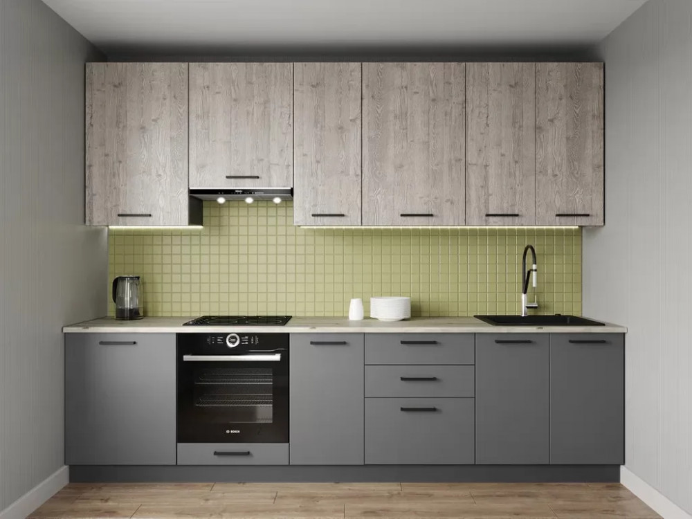 - Столешницы цельные со скруглением по переднему краю, пластиковым покрытием и силиконовый каплесборник (защищает фасады нижних модулей от попадания влаги и разбухания);