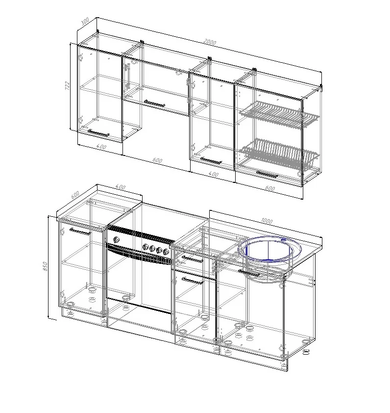 - Фасады верхних модулей со свесом – дают возможность использовать модули без установки ручек, а также установить скрытую подсветку;