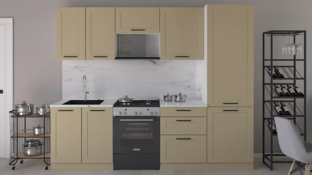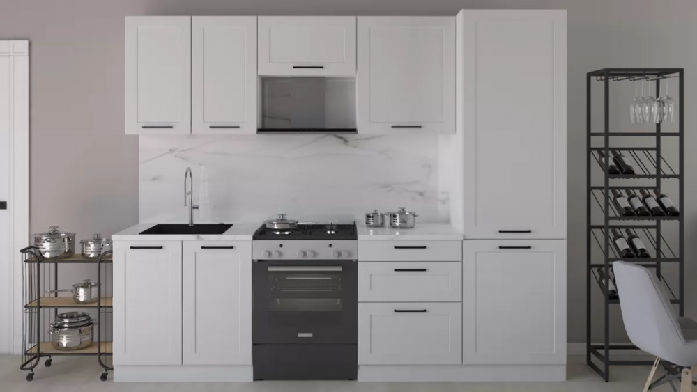 В СТОИМОСТЬ НЕ ВКЛЮЧЕНО: СТЕНОВАЯ ПАНЕЛЬ, СТОЛЕШНИЦА, БЫТОВАЯ ТЕХНИКА, МОЙКА, СМЕСИТЕЛЬ, АКСЕССУАРЫ.