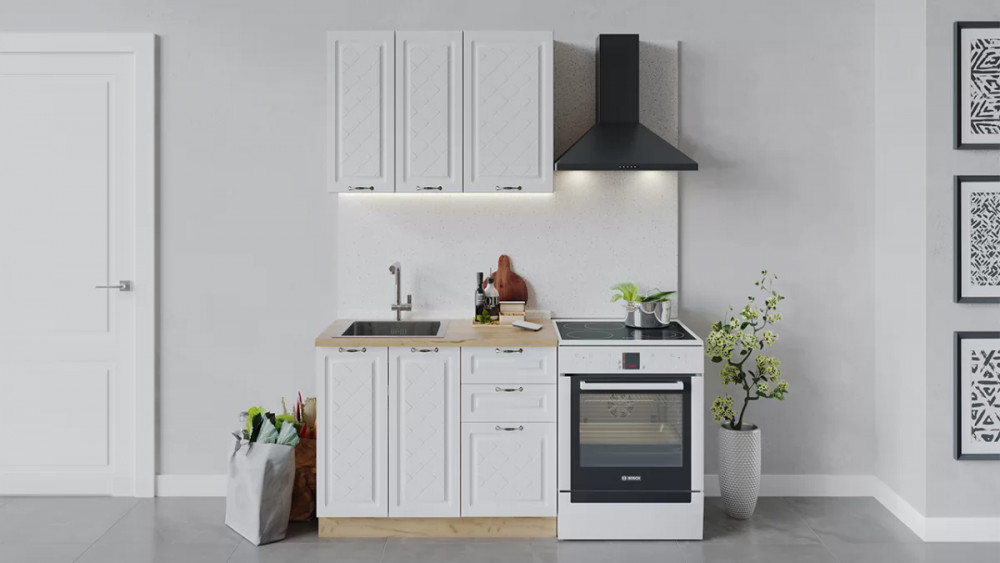 Кухня ВАНДТ 1,8м (б/сушки, б/мойки 800), ЛДСП Белый/МДФ Айвори/Лунный Кратер Б/СТОЛЕШН