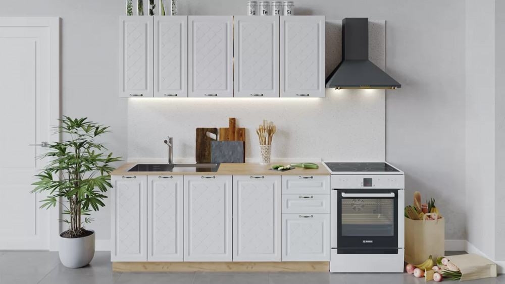 В стоимость не включено: Стеновая панель, столешница, доводчики, бытовая техника, мойка, смеситель, аксессуары