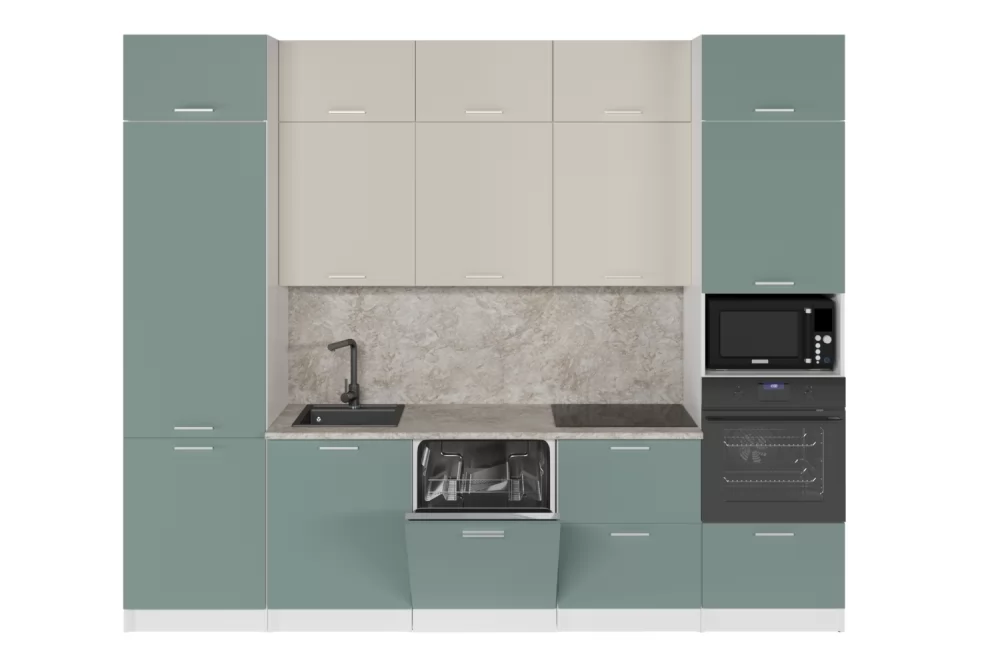Мойки, смесители, посудосушители, варочные панели, духовые шкафы, плиты, вытяжки в комплекты гарнитуров не входят.