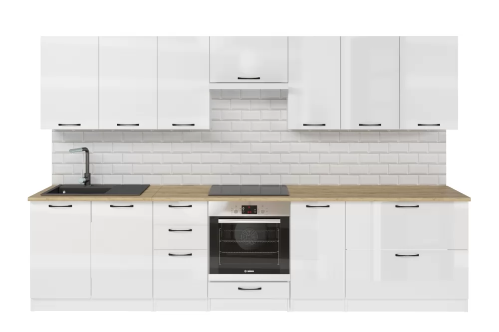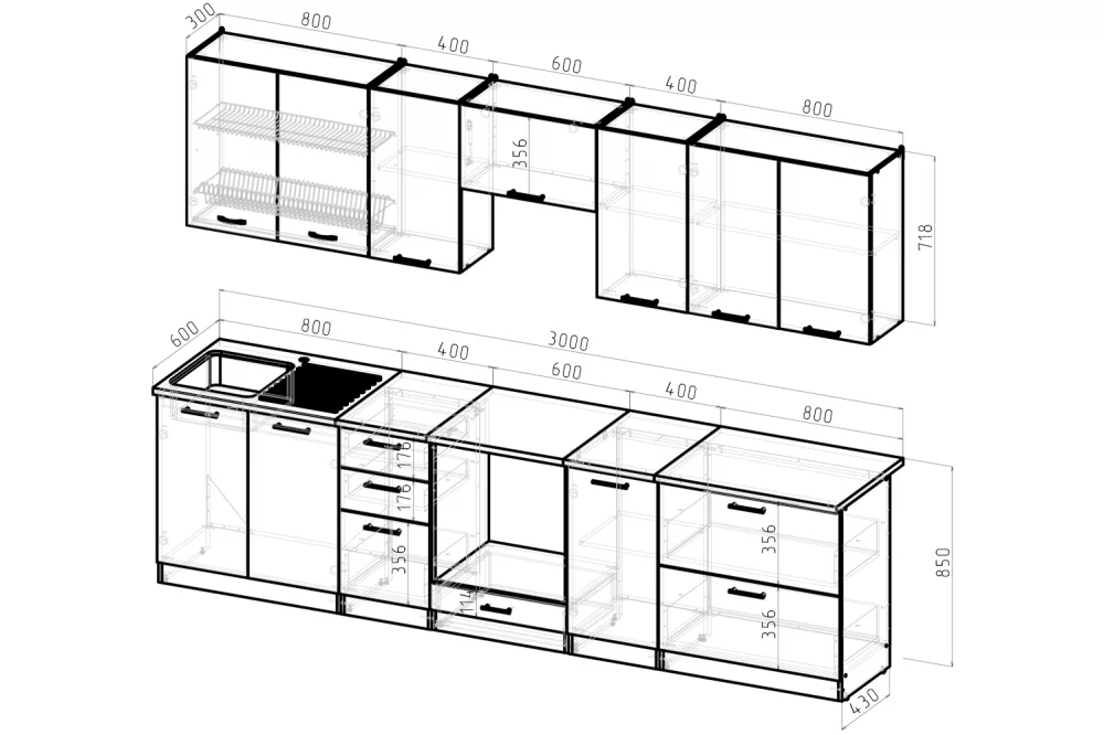 Мойки, смесители и посудосушители в комплекты гарнитуров не входят.